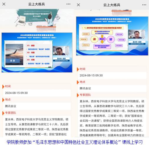 “概论”教研室全体教师于2024年8月15日上午9:00分别在线上认真聆听了西安电子科技大学夏永林教授的分享——讲好“概论”课应注意的几个问题。线上备课会由“概论”教研室主任郭超妮统筹安排。线上会议中,夏永林教授结合多年的教学经验以及指导教师参赛的经历,对“概论”课的特点、教学目的与教学定位、教学过程中存在的问题等进行了全面而详细的讲解。大家边听边认真思考与做笔记,表示收获很大。