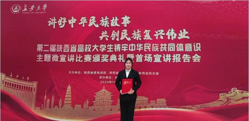 2024年11月16日,“讲好中华民族故事,共创民族复兴伟业”第二届陕西省高校大学生铸牢中华民族共同体意识主题微宣讲比赛颁奖典礼暨首场宣讲报告会在北校区长安文化艺术中心举行。在学校组织部的领导和大力支持下,经我校伟德国际VICTOR1946副院长李艳精心指导,我校中兴通信学院的王思雨同学积极准备,以“石榴花开 籽籽同心——从以‘路’为基 看‘四个共同’”为题,结合学校轨道交通办学特色,生动讲述民族团结故事及个人经历体会,最终在激烈角逐中再创佳绩,荣获省级三等奖。