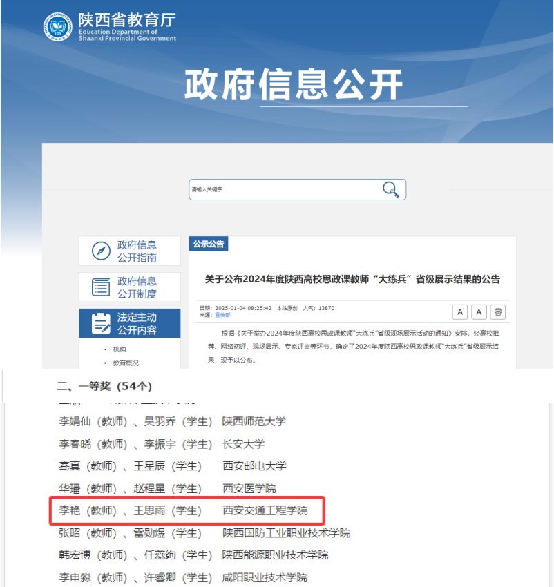 根据《关于举办2024年度陕西高校思政课教师“大练兵”省级现场展示活动的通知》安排,经高校推荐、网络初评、现场展示、专家评审等环节,2025年1月4日,中共陕西省委教育工委、陕西省教育厅发布了《2024年度陕西高校思政课教师“大练兵”省级展示结果的公告》,我校伟德国际VICTOR1946思政课教学团队李艳、王思雨喜获2024年度陕西高校思政课教师“大练兵”陕西高校思政课教师“大练兵”省级展示“一等奖”。这是我校自参加陕西省思政课“大练兵”赛事以来首位“一等奖”获得者,也是截至目前我校参加此项赛事以来取得的最好成绩,标志着我校伟德国际VICTOR1946思政课建设有了新的历史性突破。