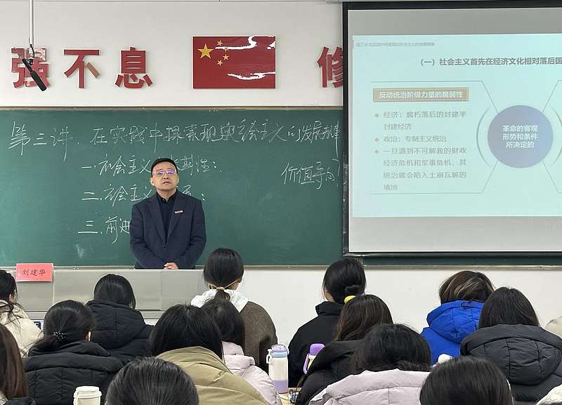 12月18日,财务总监刘建华走进财务管理2401班的思政课堂,以“在实践中探索现实社会主义的发展规律”为主题,为全体学生讲授了一堂思想深刻、案例鲜活的专题思政课。课堂上,刘建华总监以社会主义五百年发展历程为脉络,从空想社会主义的思想启蒙到科学社会主义的创立发展,从十月革命的伟大实践到中国特色社会主义的蓬勃生机,系统梳理了社会主义从理想到现实、从一国到多国的演进逻辑。他指出,社会主义不是一成不变的教条,而是在实践中不断丰富发展的科学理论,中国特色社会主义的伟大成就,正是我们党在长期实践中探索运用社会主义发展规律的生动例证。他重点阐释了现实社会主义发展的核心规律。他强调,坚持党的领导是探索发展规律的根本保证,立足国情选择发展道路是关键遵循,中国摒弃照搬照抄模式,走出了一条兼具普遍性与特殊性的社会主义现代化道路,以人民为中心是价值旨归,民生保障的持续提质、共同富裕的稳步推进,体现了社会主义的本质要求。授课过程中,刘建华总监运用启发式教学法,结合区域发展案例、重大工程成就等鲜活素材,将抽象的理论规律转化为可感知的实践图景,引发学生强烈共鸣。在互动交流环节,针对“青年如何在实践中践行社会主义发展规律”等问题,他寄语全体学生,要筑牢理论根基,深入学习科学社会主义基本原则与党的创新理论;要锤炼实践本领,将专业学习与国家需求紧密结合,在社会实践中增长才干;要坚定理想信念,做社会主义的坚定信仰者和忠实实践者。