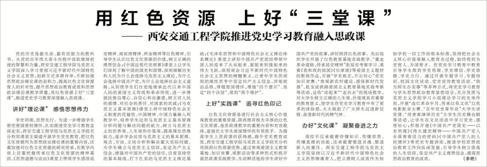 2021年12月5日出版的《陕西日报》第四版刊登了我校教师李艳撰写的《用红色资源上好“三堂课”》,文章主要从“讲好理论课、感悟思想伟力;上好实践课、追寻红色印记;办好文化课、凝聚奋进之力”三方面阐述了我校充分利用创新课程内容、红色教育基地、特色校园文化等丰富资源和多种形式推进党史学习教育融入思政课堂,深入师生头脑,指导实际工作,不断增强广大师生坚定爱党信念,淬炼政治品格,厚植爱国情怀,传承红色基因,弘扬奉献精神的政治自信和行动自觉,促进党史学习教育走深走实,推进我校思想政治教育取得新成效。