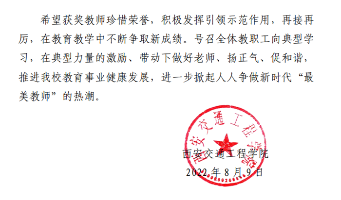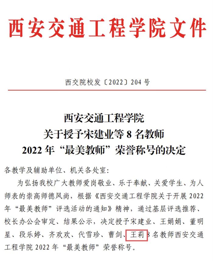 恭贺王莉教师获得2022年“最美教师”荣誉称号