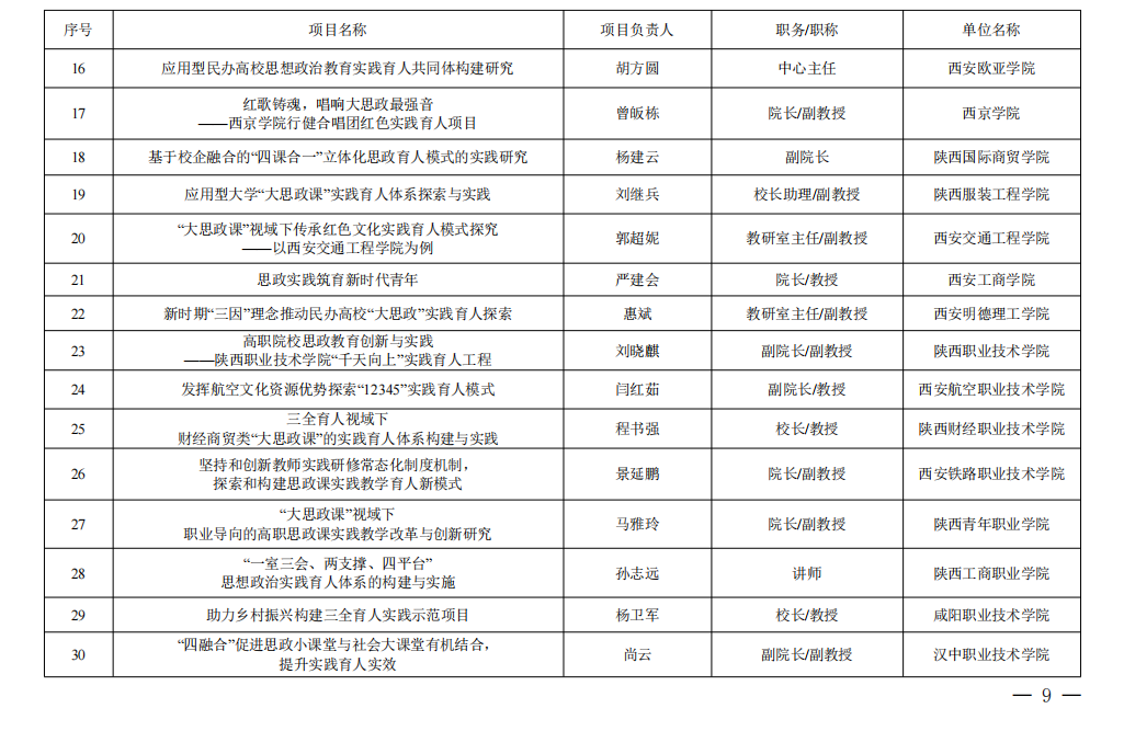 据悉,此次关于设立陕西省“大思政课”建设试点项目旨为深入学习贯彻党的二十大精神,认真落实省第十四次党代会精神和省委第21次常委会会议要求,进一步推进全国“大思政课”建设综合改革试验区陕西省试点建设,省委教育工委、省教育厅在全省教育系统组织开展了陕西省“大思政课”建设试点项目申报工作,经各地各校推荐、专家评审、会议研究,决定设立陕西省“大思政课”建设试点项目144项。