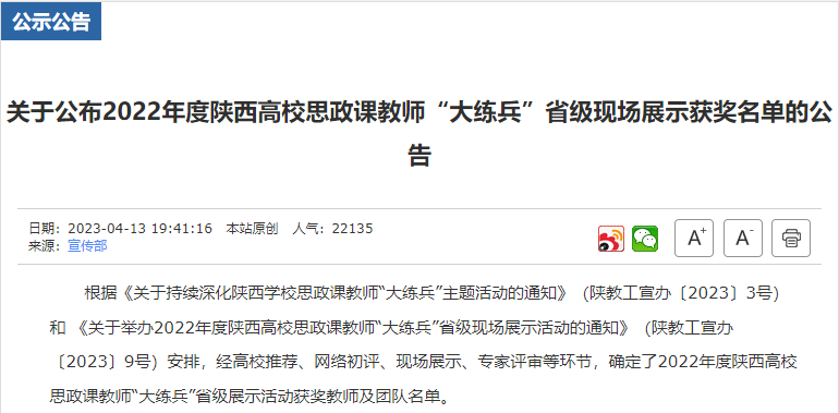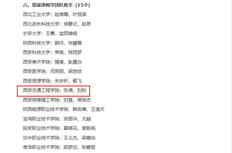 根据《关于持续深化陕西学校思政课教师“大练兵”主题活动的通知》和 《关于举办2022年度陕西高校思政课教师“大练兵”省级现场展示活动的通知》\安排,经高校推荐、网络初评、现场展示、专家评审等环节,我校伟德国际VICTOR1946思政课教学团队张倩、刘盼喜获2022年度陕西高校思政课教师“大练兵”思政课教学团队能手荣誉称号。