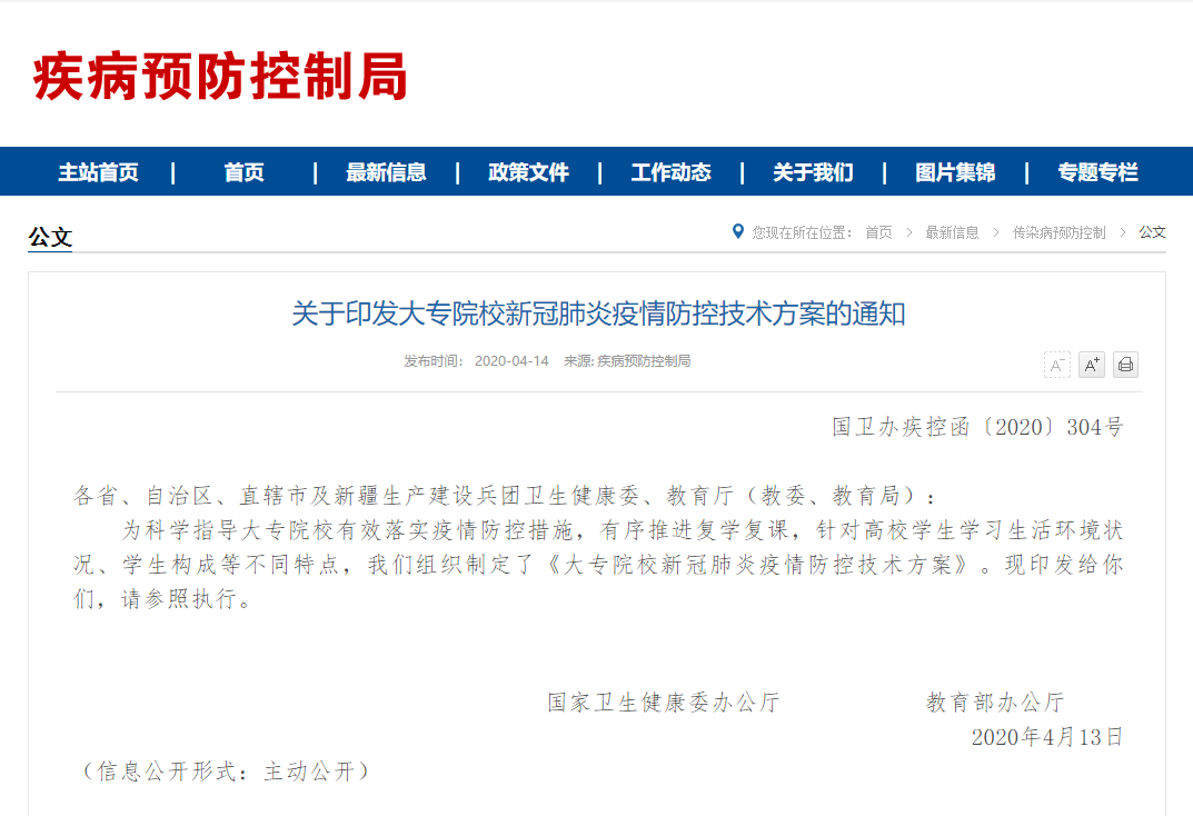 4月14日,国家卫生健康委、教育部对大专院校疫情防控提出明确要求,制定了《大专院校新冠肺炎疫情防控技术方案》。