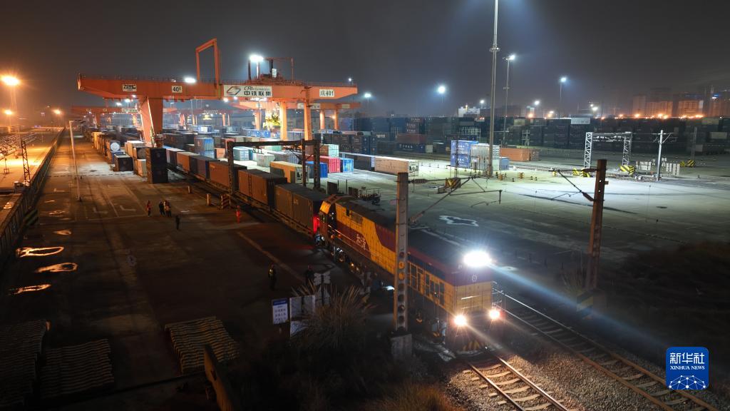 2022年1月28日,中欧班列X8086/5次列车驶出成都铁路集装箱中心站,这是中欧班列累计开行的第5万列列车(无人机照片)。新华社发(白桂斌 摄)
